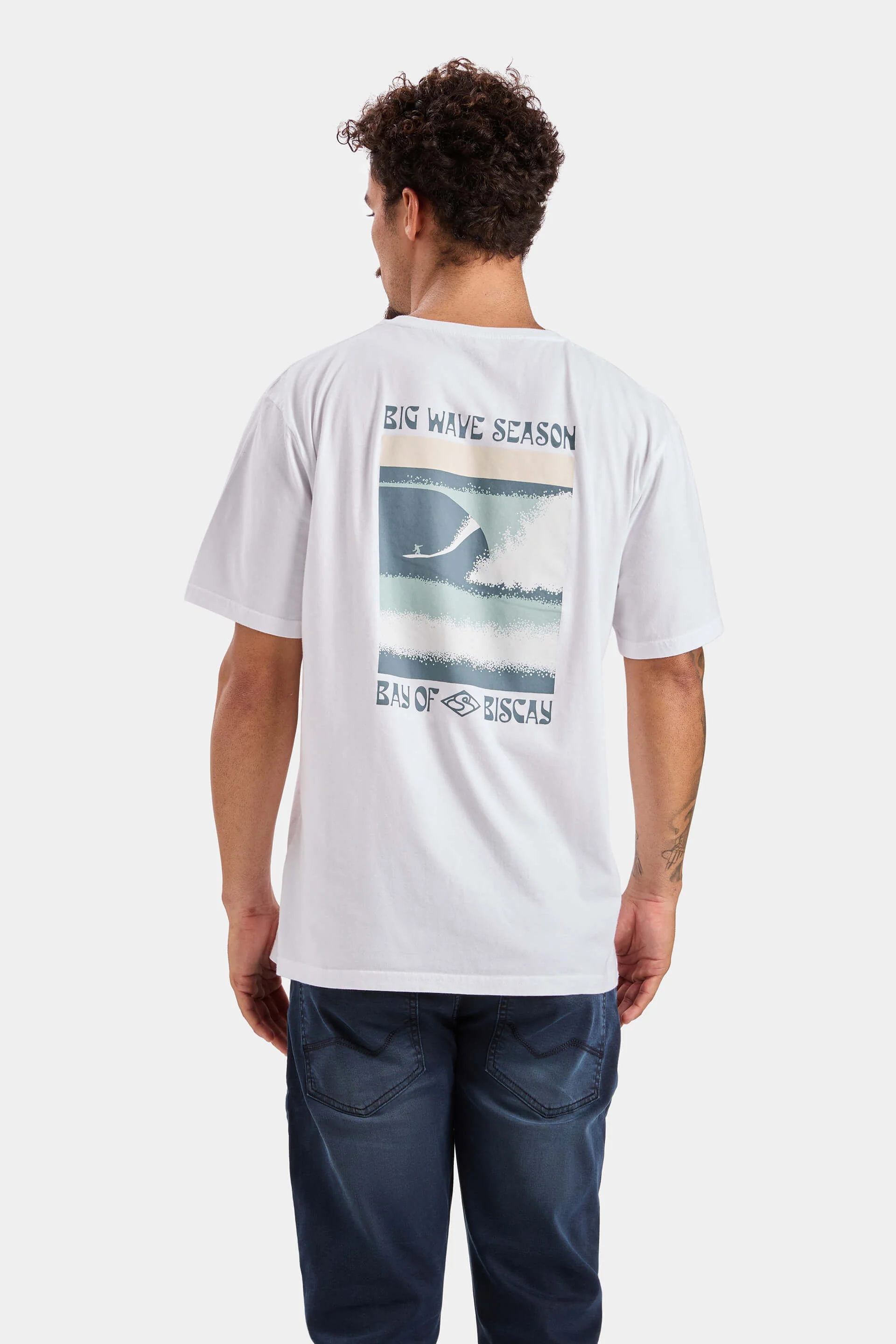 Camiseta blanca de manga corta con estampado pequeño en el pecho y gráfico grande en la espalda.