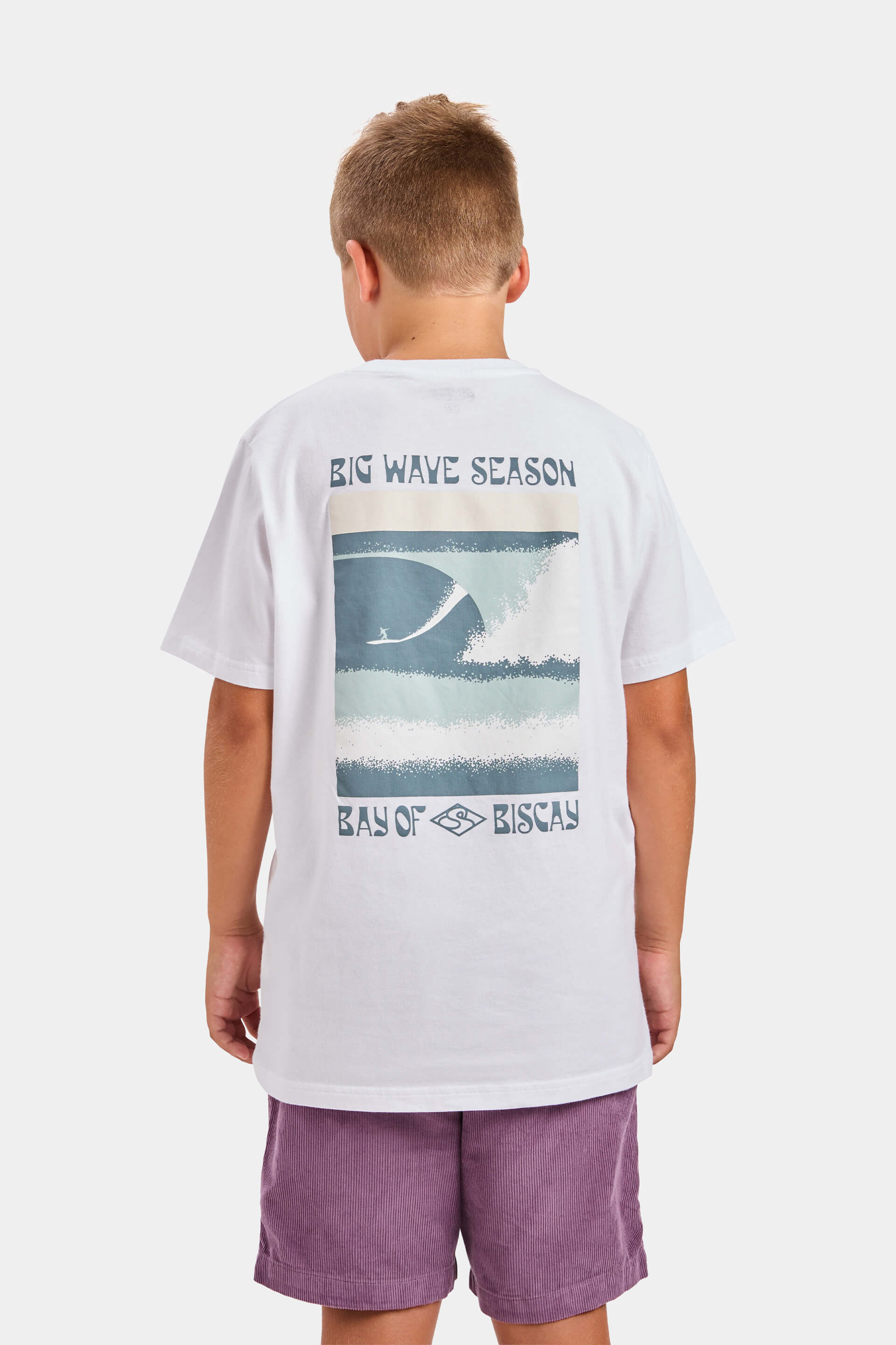 Camiseta blanca de manga corta con estampado pequeño en el pecho y gráfico grande en la espalda.