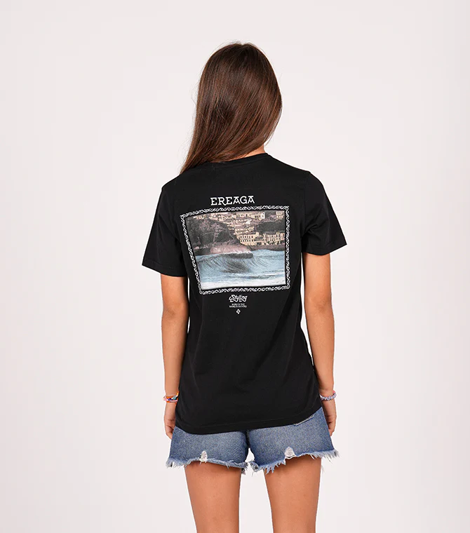 Camiseta Styling – Modelo Ereaga. Camiseta de manga corta en color negro con estampado pequeño en el pecho y gráfico grande en la espalda.