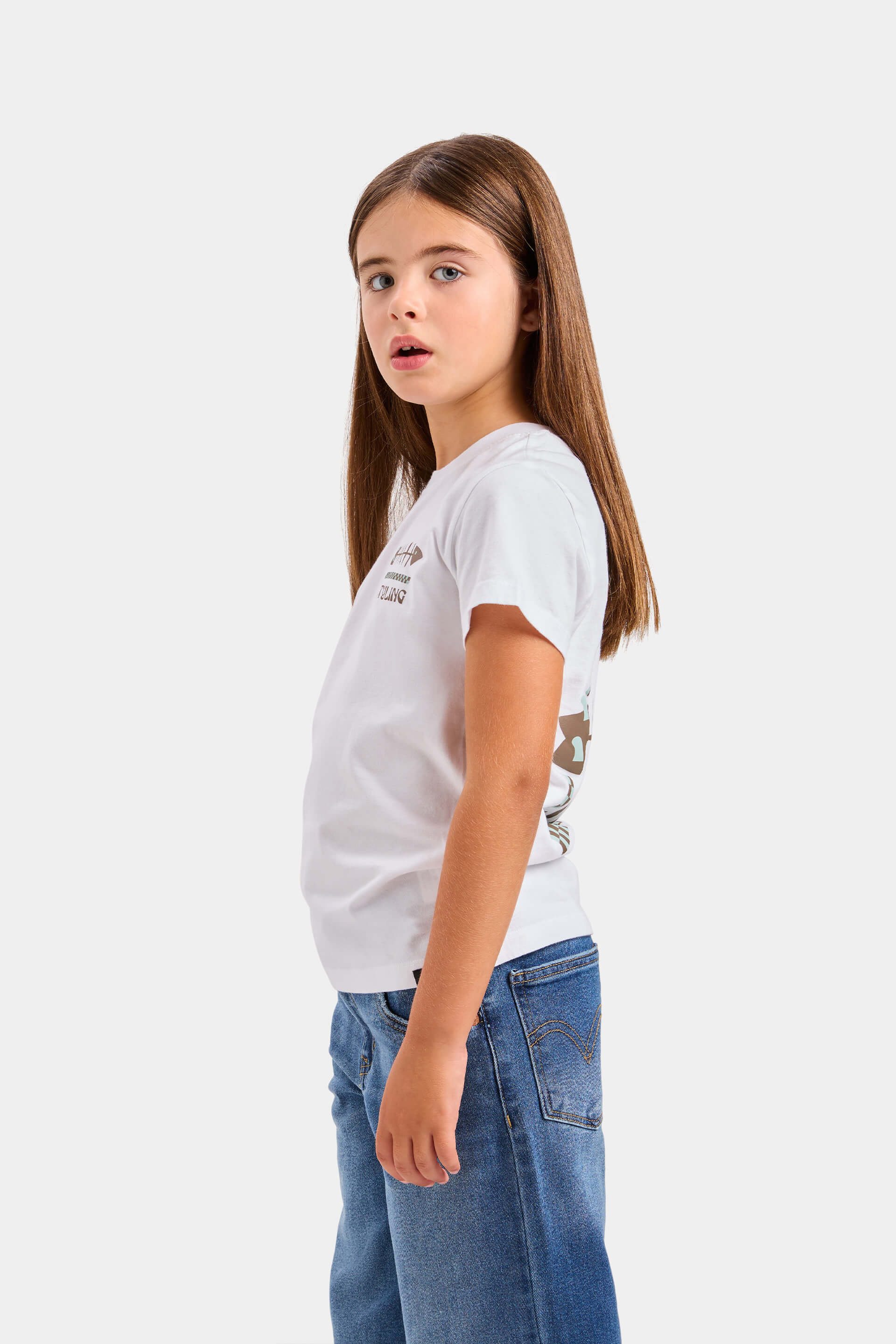 Camiseta de manga corta en color blanco con estampado pequeño en el pecho y gráfico grande en la espalda.