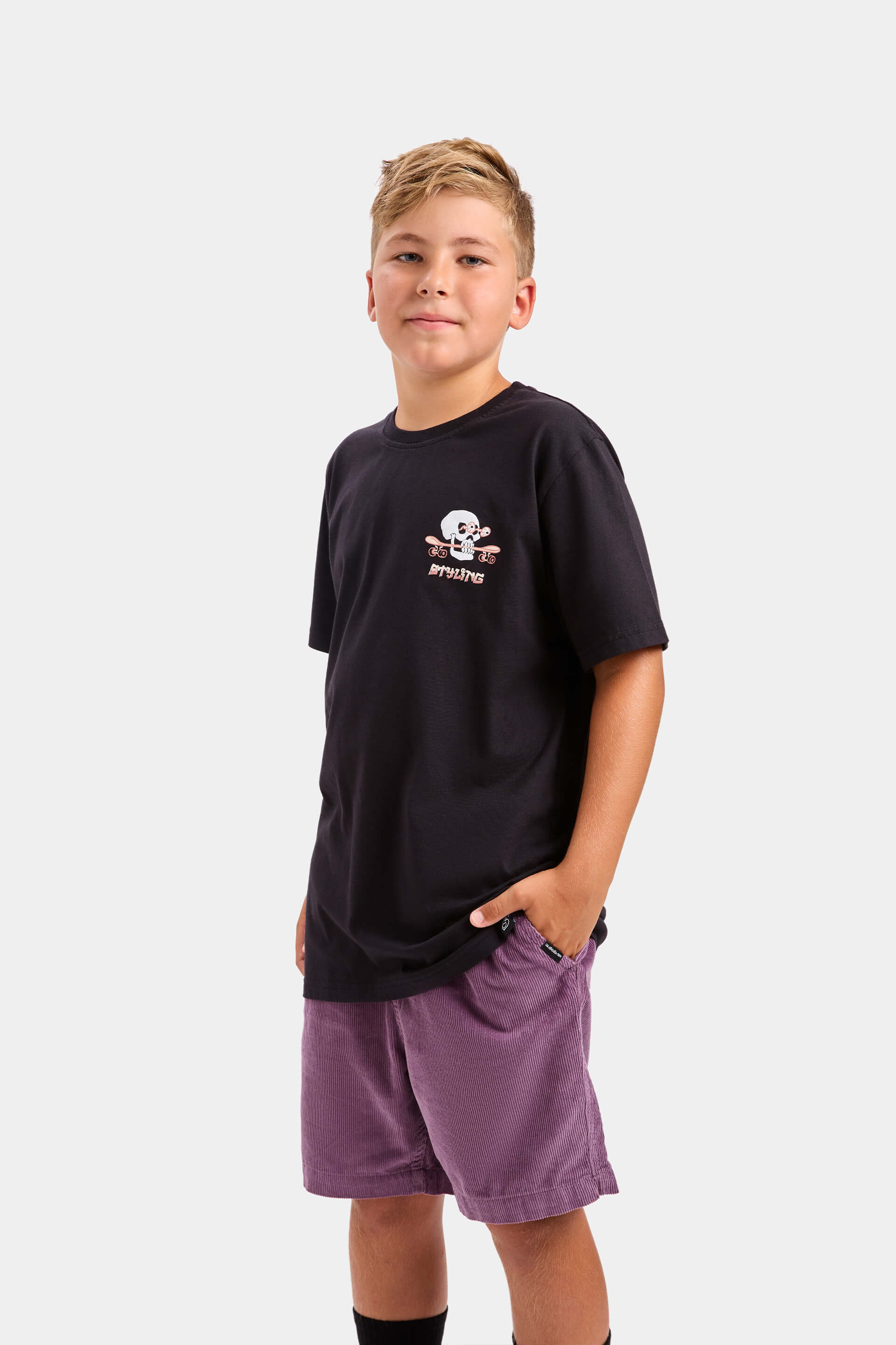 Camiseta negra de manga corta con estampado pequeño en el pecho y gráfico grande en la espalda.