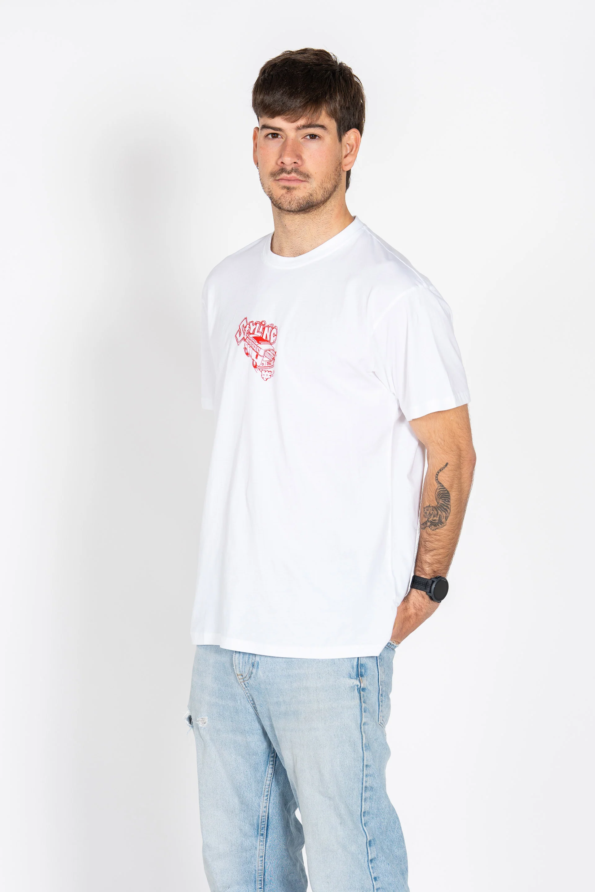 Camiseta de manga corta surf hombre en color blanco con diseño gráfico estilo cómic de la cápsula Styling Toons. Estampado frontal con identidad cartoon y parte trasera lisa.