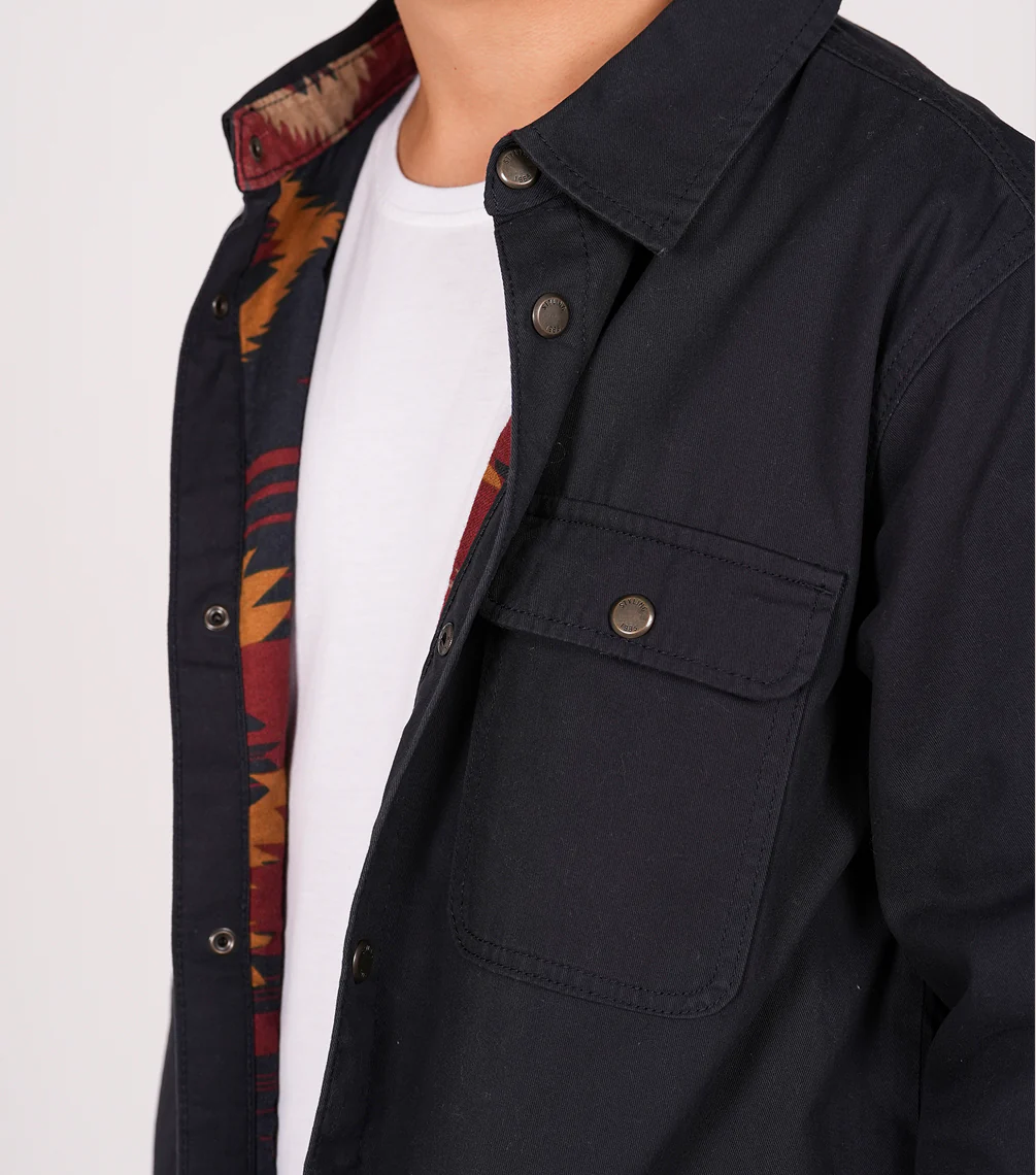 La Kace es una chaqueta versátil de estilo overshirt, perfecta para entretiempo. Confeccionada en color Dark Navy, destaca por su forro interior con estampado étnico que aporta un contraste único y lleno de personalidad.