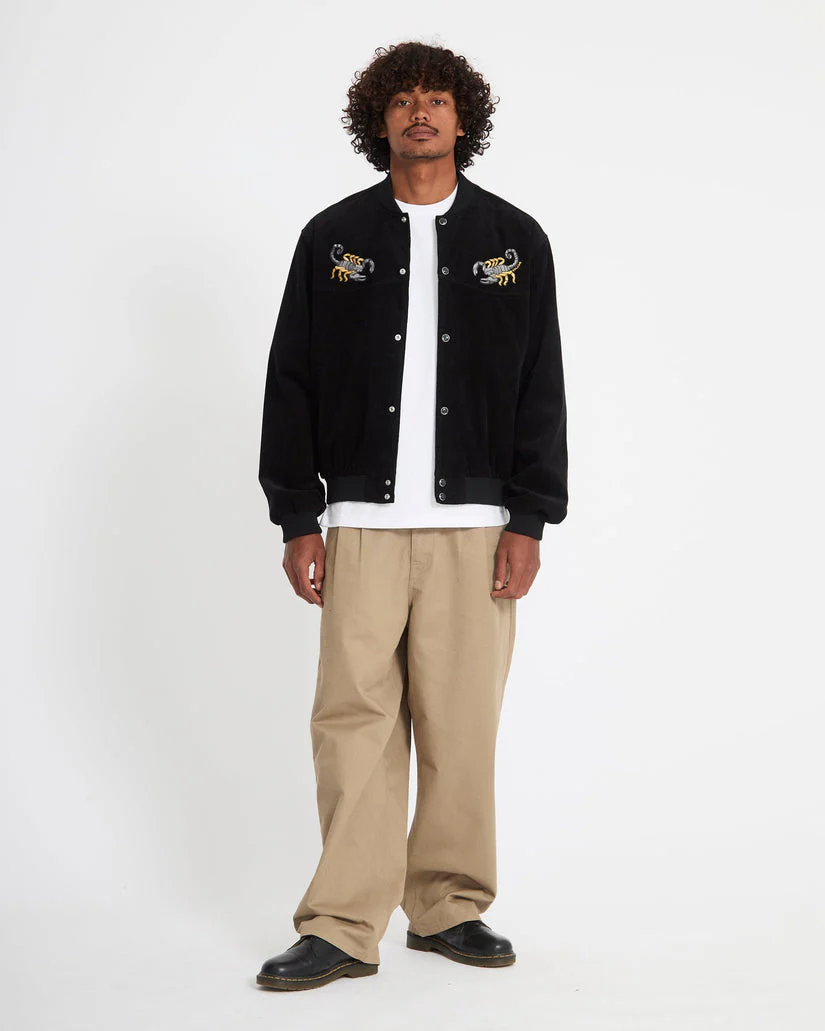 Chaqueta varsity de pana para hombre de grosor medio, inspirada en la estética western. Presenta bordados en el pecho y la espalda con el diseño artístico del Featured Artist Mickey Mason. Corte relaxed, largo hasta la cintura y cierre delantero con botones a presión. Incorpora mangas y bajo de canalé, bolsillos en la cintura y bolsillo interior. Forro de tafetán 100 % poliéster con estampado.