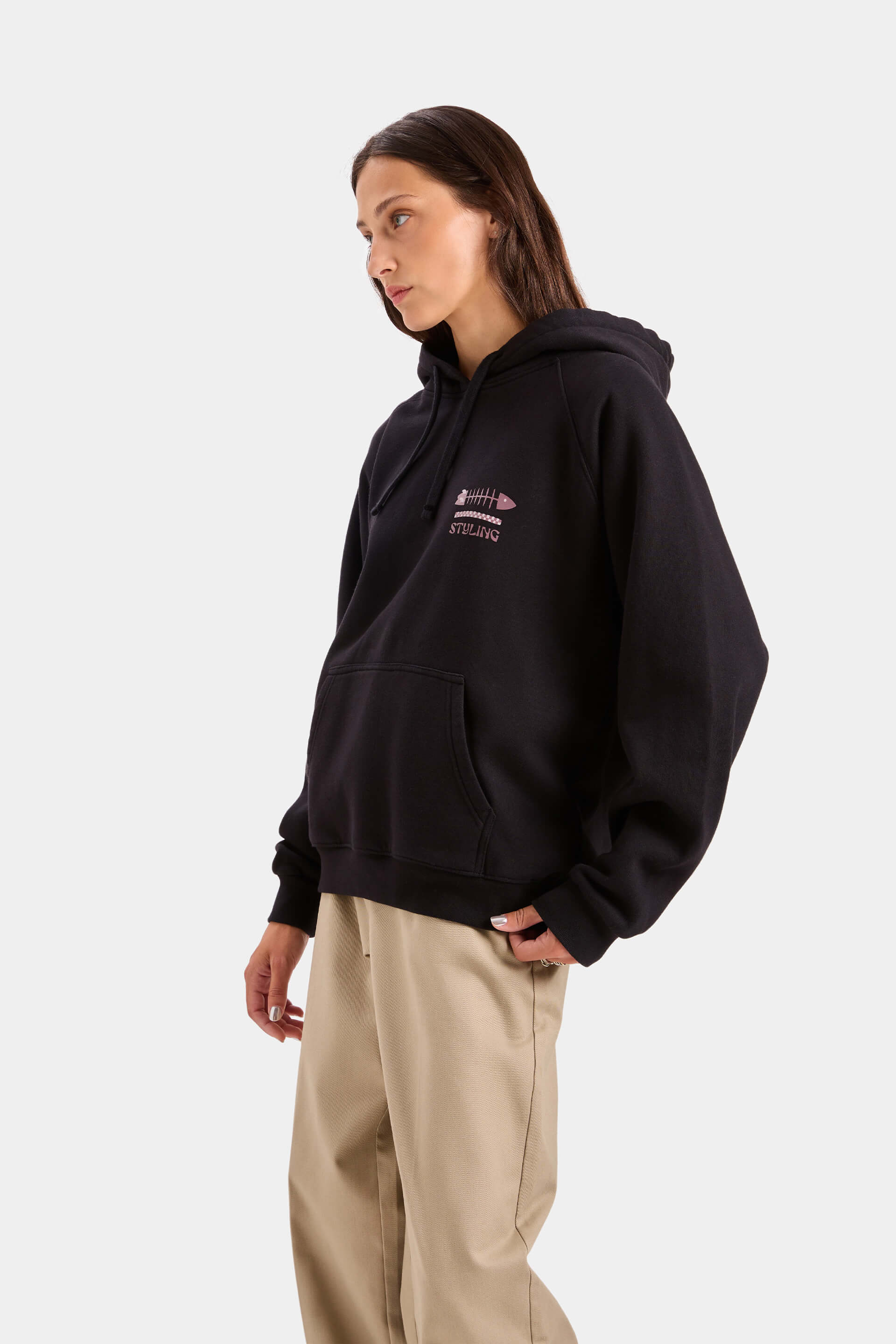 Sudadera capucha en color negro con un pequeño estampado en el pecho y un gráfico grande en la espalda.