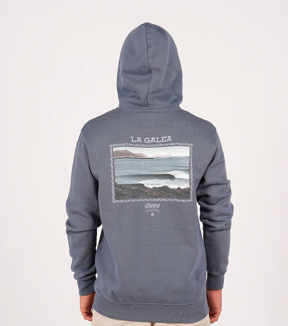 Sudadera Styling – Modelo La Galea. Sudadera hood en color indigo con estampado pequeño en el pecho y gráfico grande en la espalda.