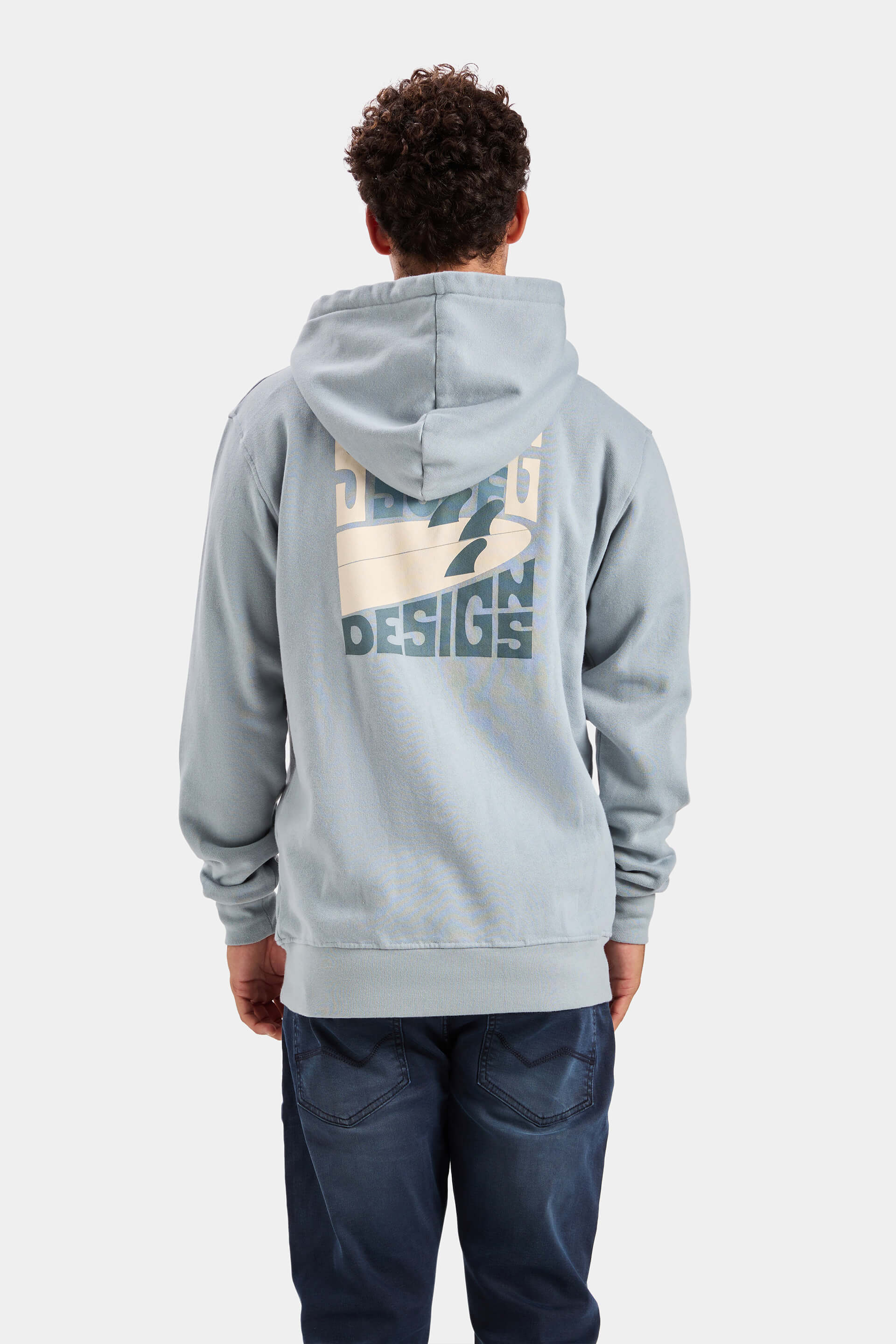 Sudadera con capucha en color plomo con estampado pequeño en el pecho y gráfico grande en la espalda con diseño Surf Disings.